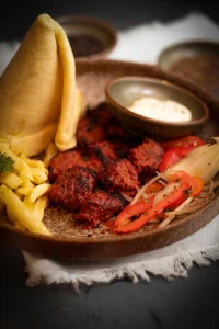 Grilled meat lovers will find great options! They offer Shish Tawook (chicken skewers), Kofta Kebab (minced meat skewers), or Lamb Kebab. All are perfectly seasoned and grilled to achieve a juicy interior and a slight char on the outside. Served with basmati rice and fresh salad, these dishes satisfy and burst with flavor. Picture this: the distinct aroma of grilled meat blending with strong Middle Eastern spices. Every bite becomes an extraordinary experience.