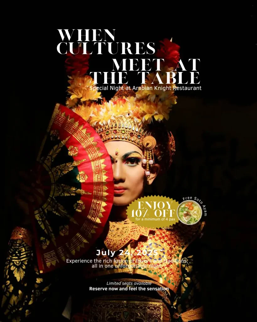 Get ready for an evening where two cultures unite in harmony the calming melodies of Balinese rindik music meet the rich, aromatic flavors of the Middle East.