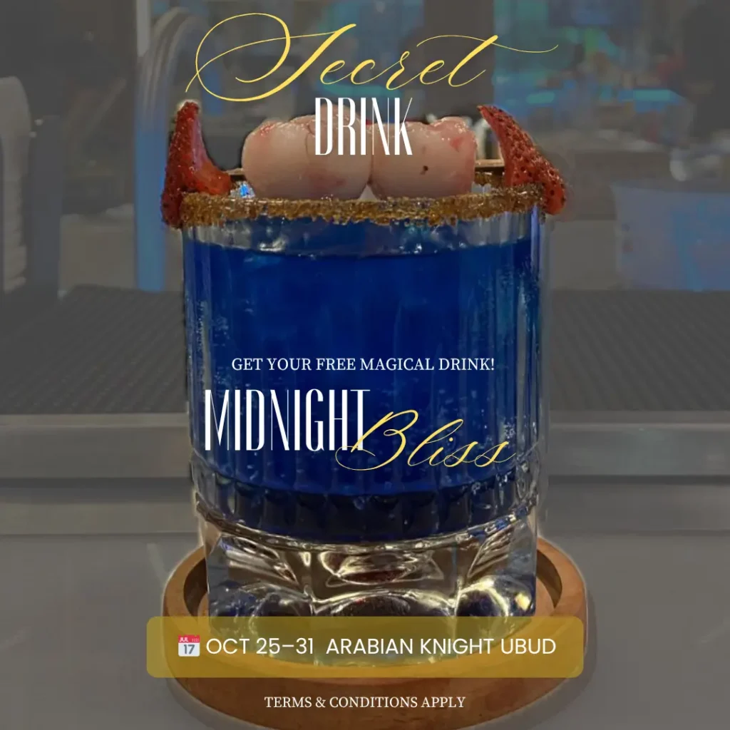 Get ready to indulge in the enchantment of Midnight Bliss our mystical signature mocktail that glows as beautifully as your night at Arabian Knight Ubud.